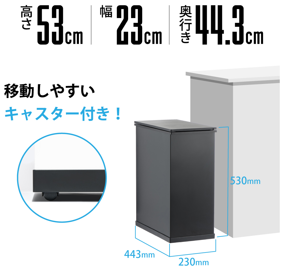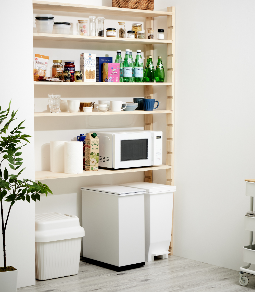 幅を取らないスリム設計だから、冷蔵庫横やカウンター下にもスッキリ収納可能。